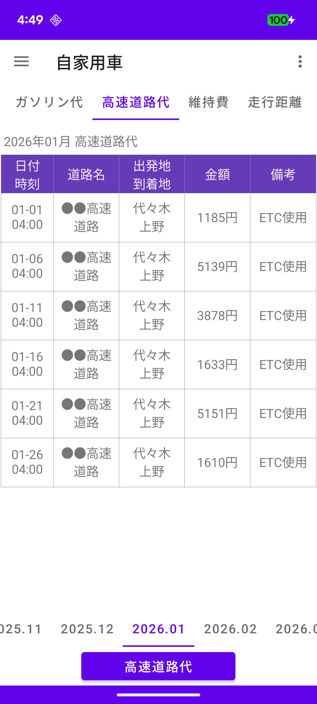 高速道路代、メンテナンスの記録をします。