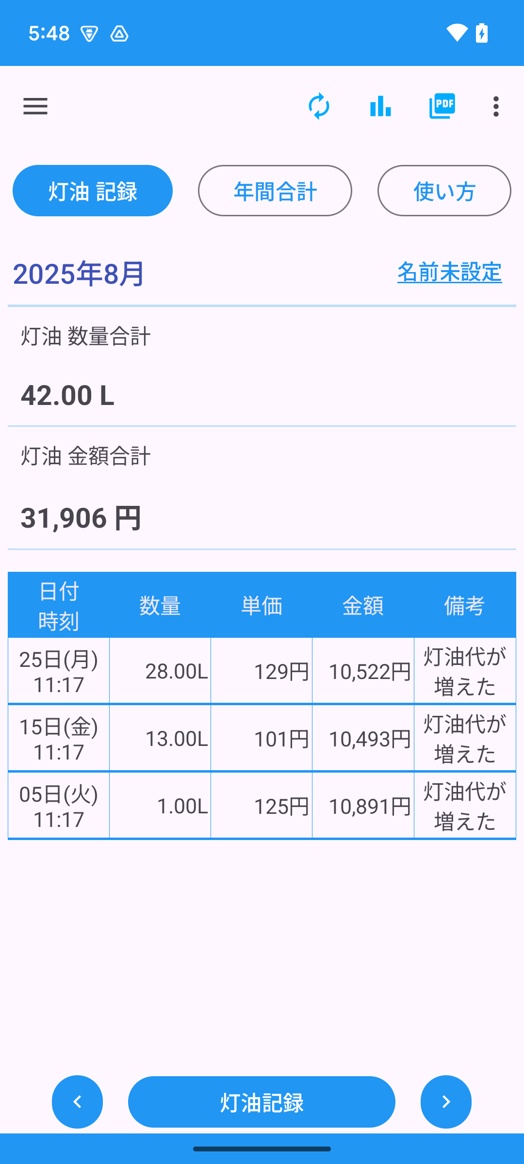 灯油を記録するには灯油記録ボタンより年月日、時刻、数量、単価、金額を記録できます。