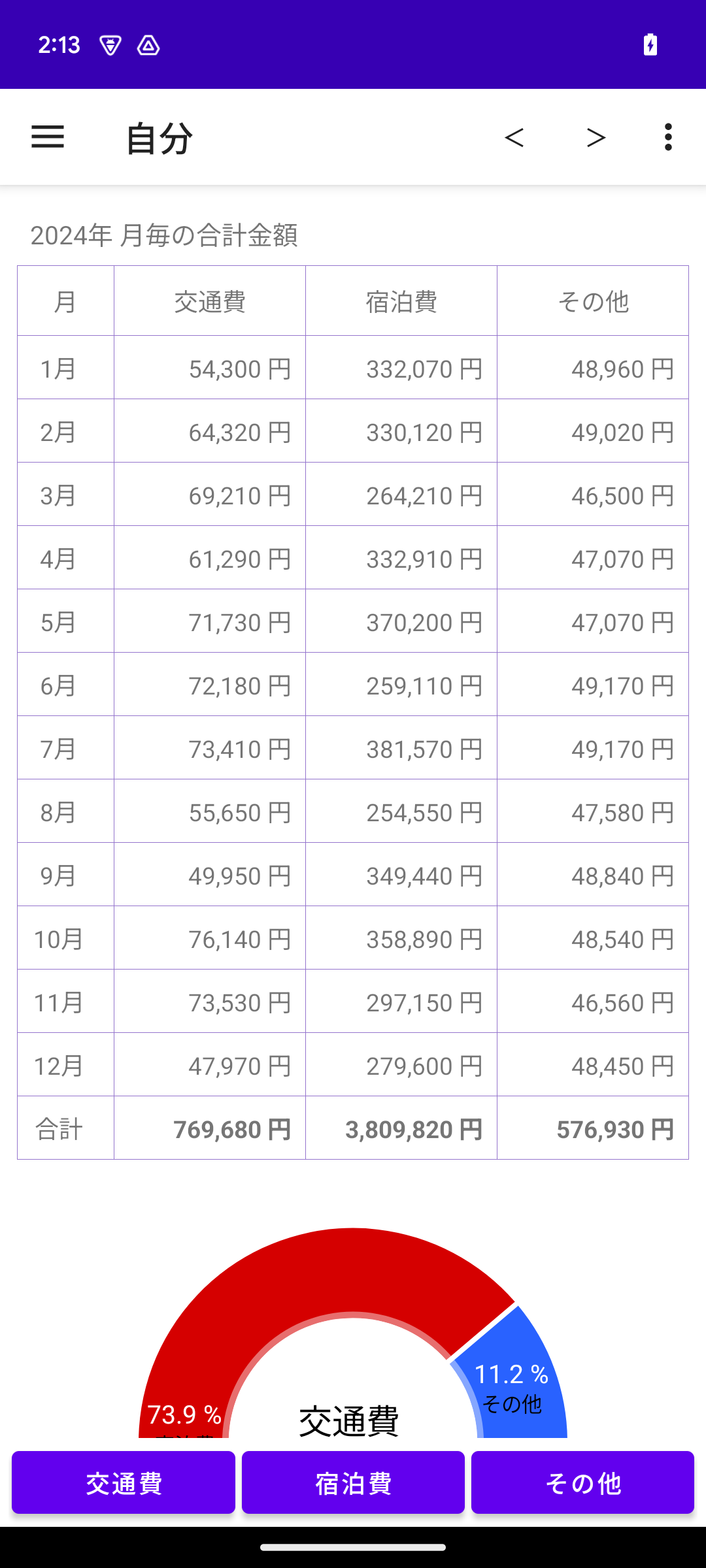 グラフで交通費、宿泊費、その他を確認することで、どの月が多いか把握できます。